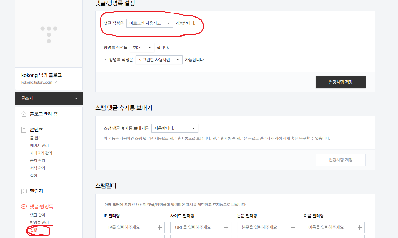 📌 관리자 페이지에서 댓글,방명록 카테고리에서 설정을 클릭하여