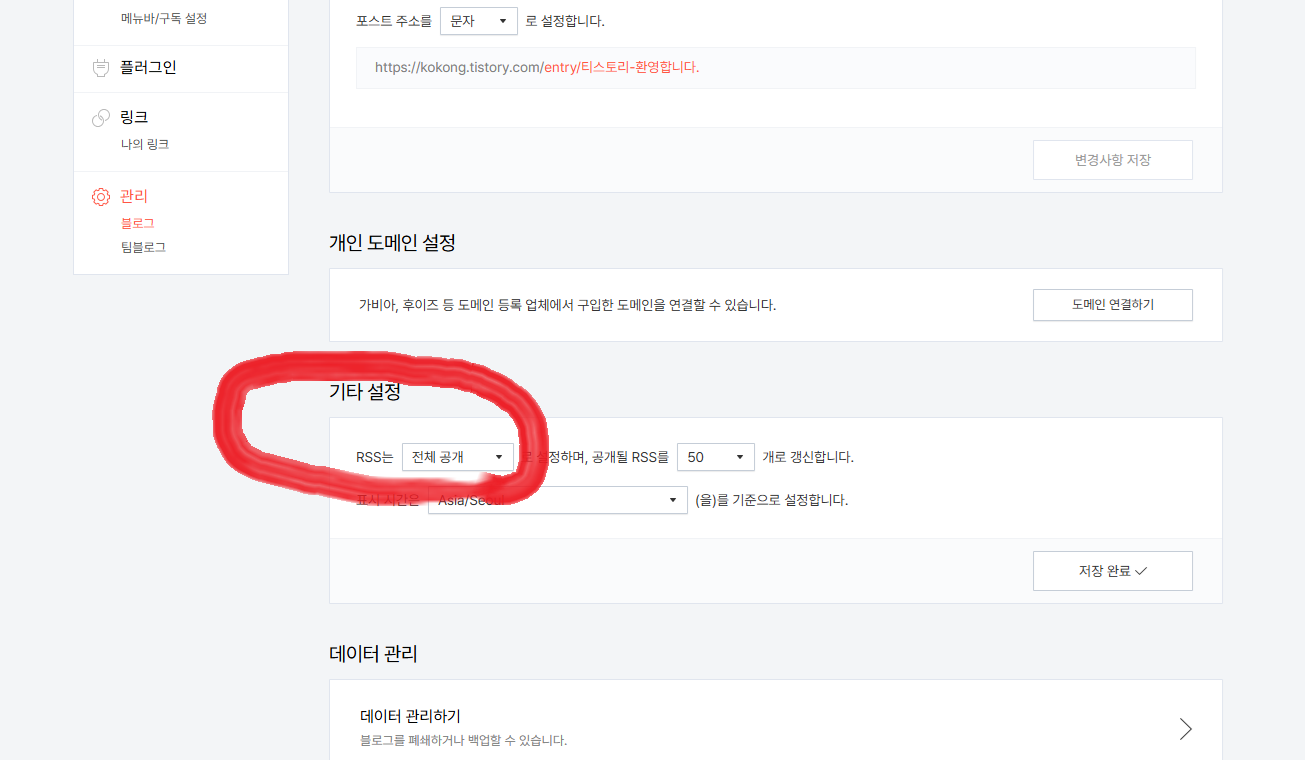 📌 관리자 페이지에서 왼쪽 제일 밑에 관리 카테고리에 블로그를클릭해서 아래 설정도 함께 해주세요: