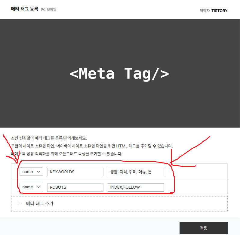 - 티스토리 관리자 → 스킨 편집 → 메타 태그 등록 클릭